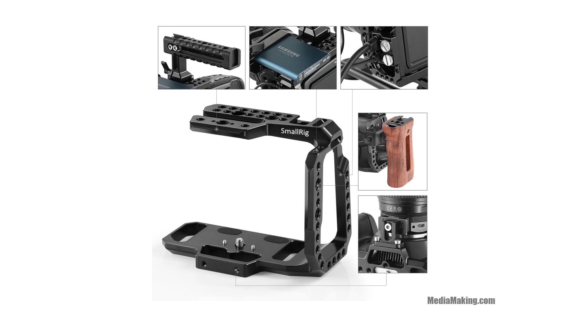 The SmallRig half cage for Blackmagic Design Pocket Cinema Camera 4K and 6K (old version) CVB2254 is a form-fitting cage. It is securely locked to the camera by 1/4’’ screws on the top and bottom, with additional locating pins and rubber pads on the base plate preventing wiggles and scratches. On the top and left side are built-in NATO rails, where you can attach SmallRig NATO Top Handle 1955 and SmallRig Wooden NATO Side Handle 2187 to conduct hand-held shooting. Multiple mounting points such as 1/4’’ and 3/8’’ threaded holes, cold shoe and ARRI locating holes are perfect for attaching accessories. For users who record with SmallRig Samsung T5 SSD Mount 2245 is a good choice. The cage is compatible with SmallRig HDMI and USB-C Cable Clamp 2246 to fix the cables. It works with SmallRig Lens Mount Adapter Support 2247 to keep your lens stable.