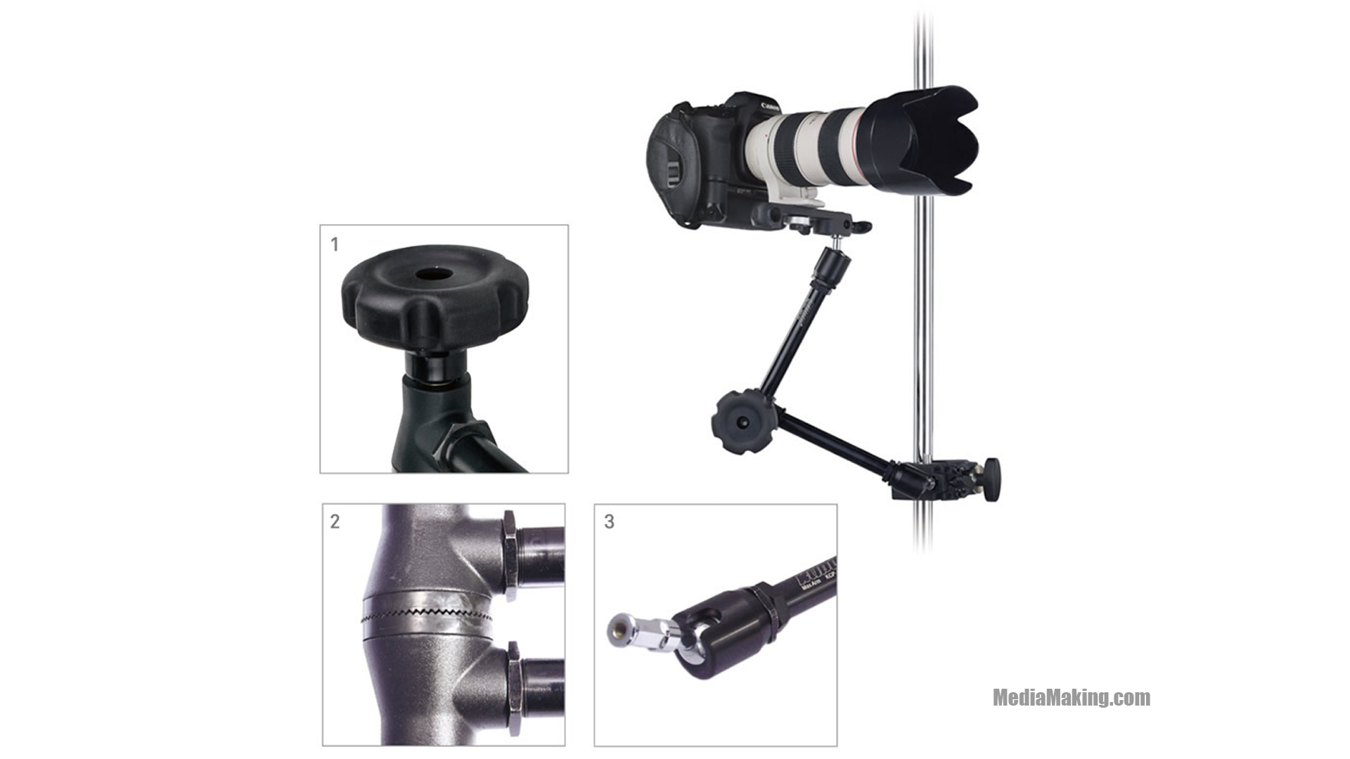 Magic max arm KCP-101W by KUPO has a wheel handle and rubber cover. This is a standard accessory designed for more comfortable and better torque while tightening the round knob, especially for those users without gloves in a cold working environment. This is made by silicon rubber which offers excellent weather durability for long-lasting operation.