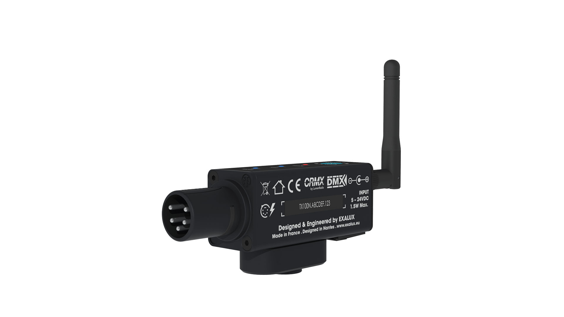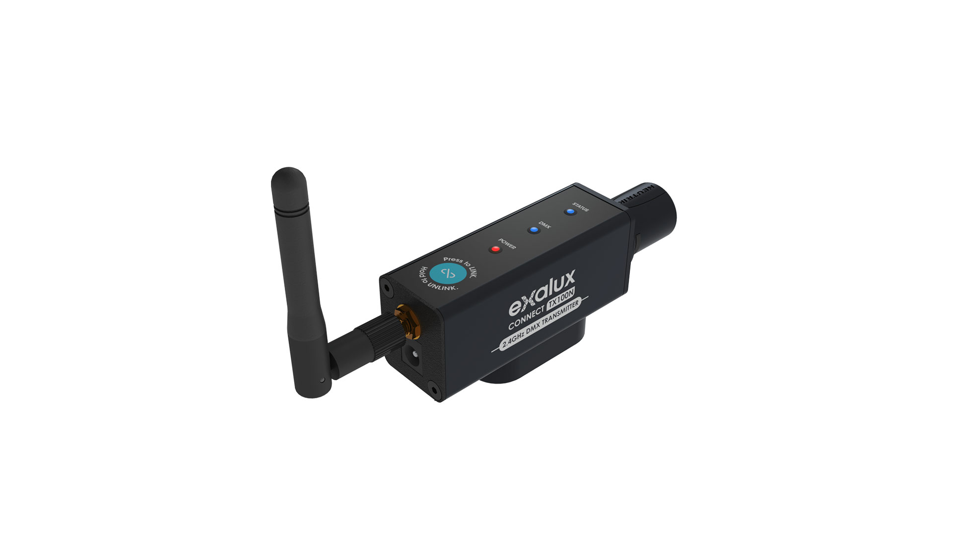 Exalux Connect TX100N Kit is an ultra compact wireless DMX transmitter that can be used in the studios or on location. Connect it to your DMX console and turn it into a wireless DMX console allowing you to control all your CRMX compatible lighting fixtures. This wireless transmitter features PoD technology which enables the unit to be powered via its XLR connector. The unit is fully compliant with all receivers, such as Exalux RX100S and RX200N. Connect TX100N can be mounted on industry-standard AV/Cinema clamps, tripods and arms thanks to the 3/8 UNC adapter. The antenna is removable, meaning you can replace it by a different model to better suit your needs.