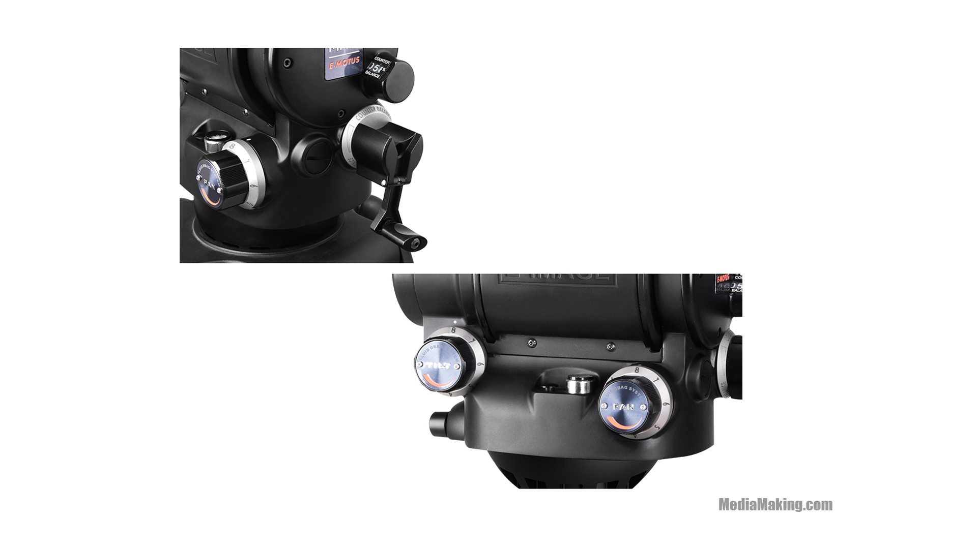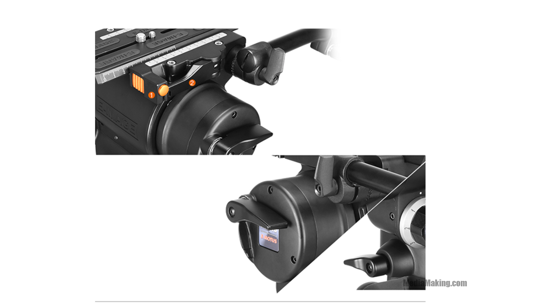 The E-IMAGE MOTUS 32 video tripod kit is composed by a MH32 fluid head and a heavy duty carbon fiber tripod legs ECT100M with EI-7000L middle spreader and rubber feet. It supports cameras and accessories weighing up to 32kg. The head and legs feature a 100mm bowl. The tripod extends to a height of 175cm and collapses down as low as 78cm. Thanks to the continuous variable counterbalance – CVC it can provides precise adjustment and wide application for different cameras. It features an independent fluid drag adjustment for both Pan and Tilt (Fluid Drag System) and a DLS double locking system for QR plate.