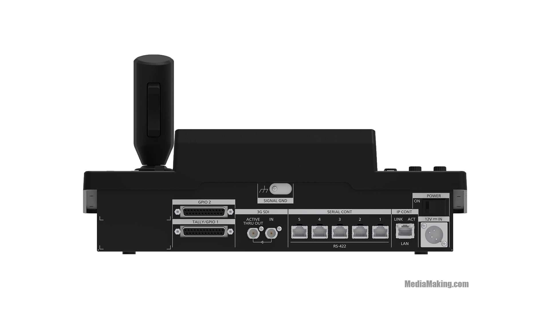 A joystick-mounted rocker lever manages pan and tilt, zoom and focus operations.