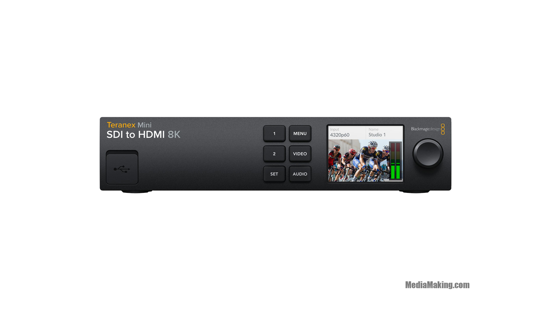 The Blackmagic Design Teranex Mini SDI to HDMI 8K Converter is an advanced 8K monitoring solution for large screen televisions, video projectors, and DisplayPort monitors. Unlike basic converters, Teranex Mini 8K HDR can use third-party calibration probes to accurately align connected displays for precise color. There are 2 on‑screen scopes that can be selected between WFM, Parade, Vector, and Histogram. Teranex Mini SDI to HDMI 8K HDR is perfect for film studios and broadcasters who need professional but affordable color-accurate monitoring, while Teranex Mini SDI to DisplayPort 8K HDR also works with the latest 8K DisplayPort monitors. You also get an elegant design with a color LCD for monitoring and control of settings!