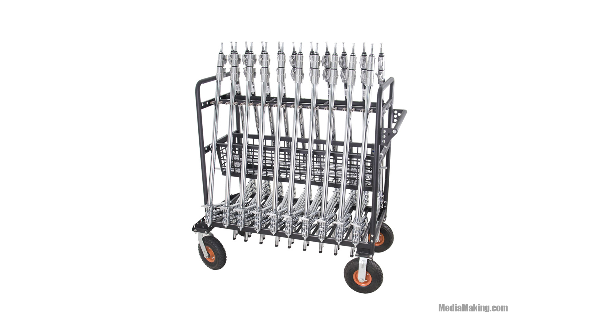 Questo carrello per trasporto grip realizzato in robusto acciaio può contenere fino a 20 C-Stand e dispone di un cestello in acciaio per il posizionamento di diversi accessori grip.