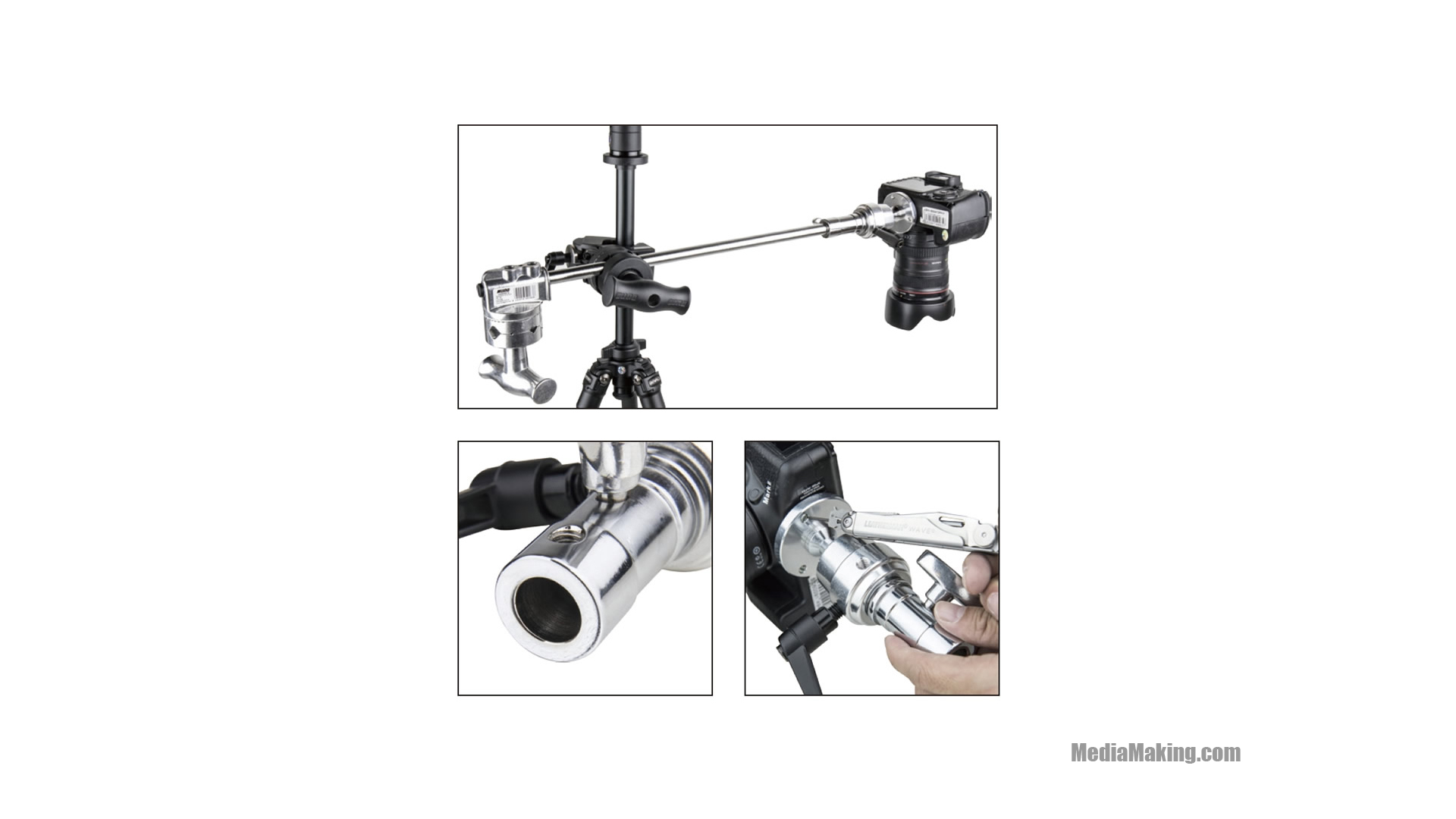 Il braccetto EI-A80 per luci e microfoni è dotato di 3 testine con attacchi da 1/4″ capaci di supportare lucine a LED e microfoni.