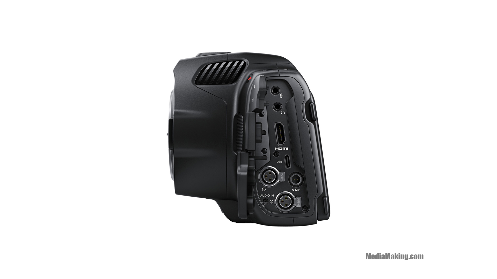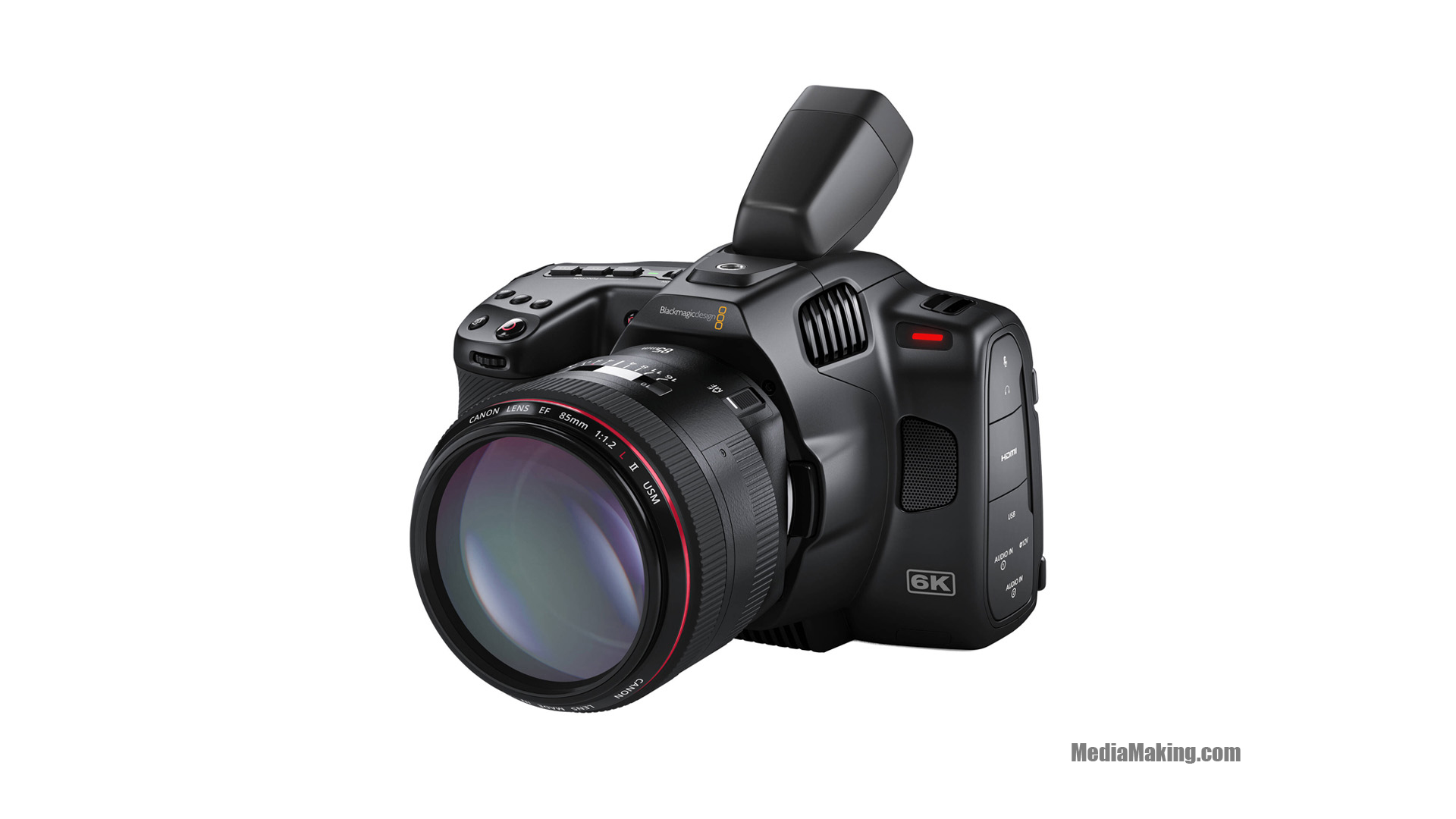 Oltre alla chiave di attivazione di DaVinci Resolve Studio, la Blackmagic Pocket Cinema Camera 6K Pro viene fornita con un alimentatore da 30W che offre la ricarica simultanea della batteria, una batteria MP-F570, un tappo per la porta dell’obiettivo e una cintura.