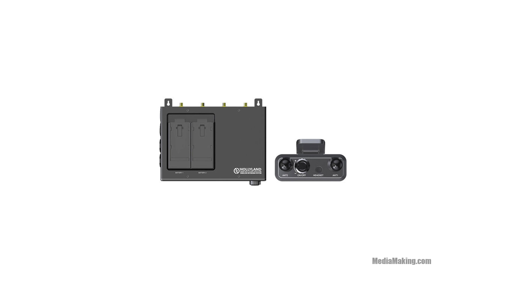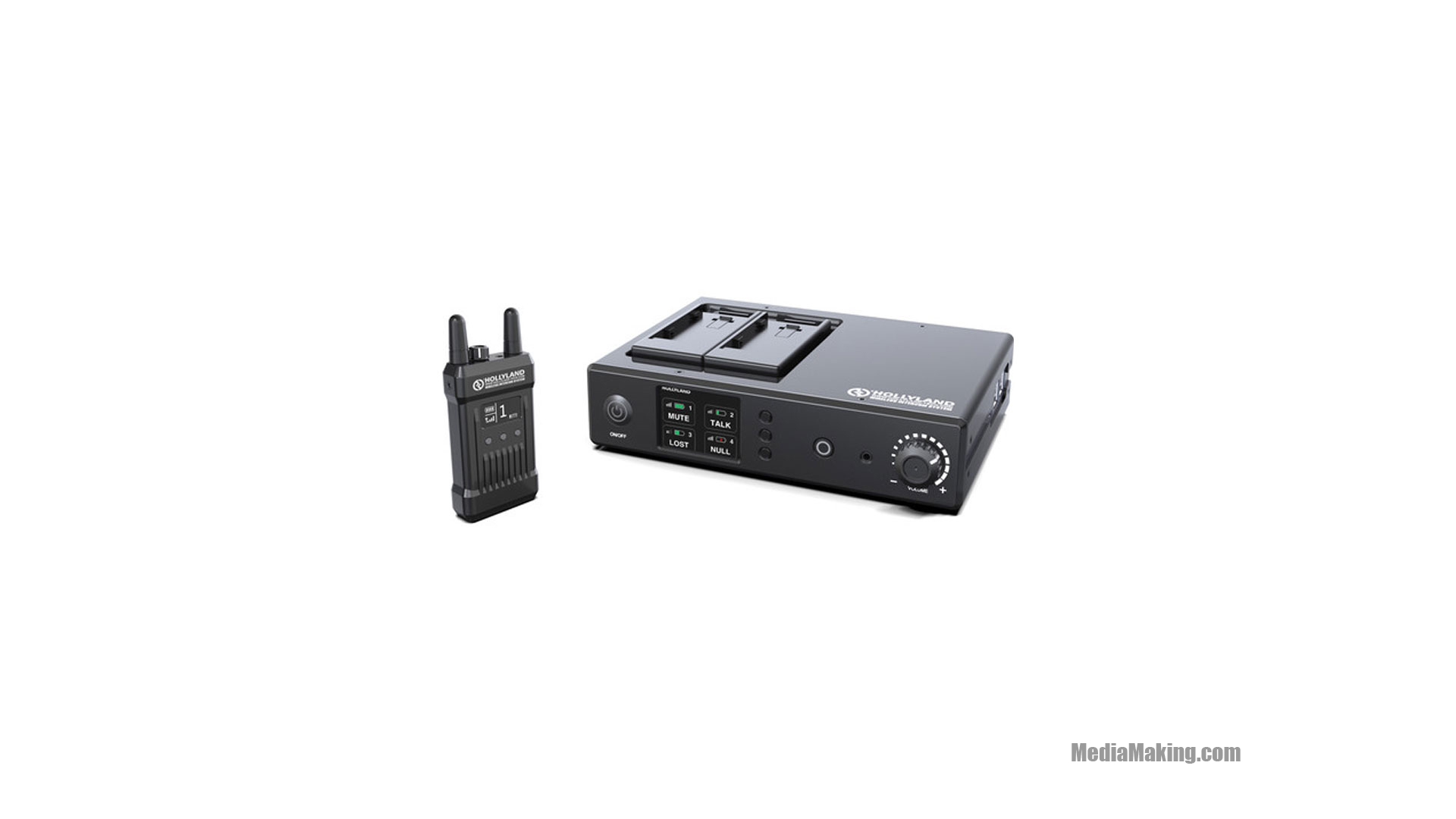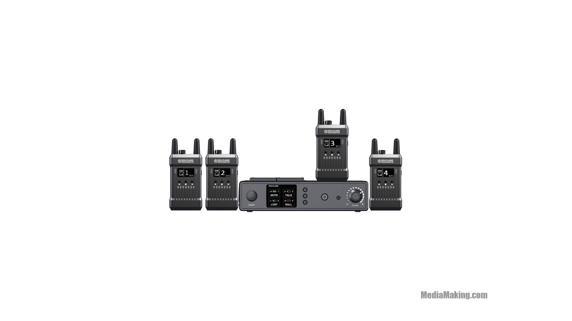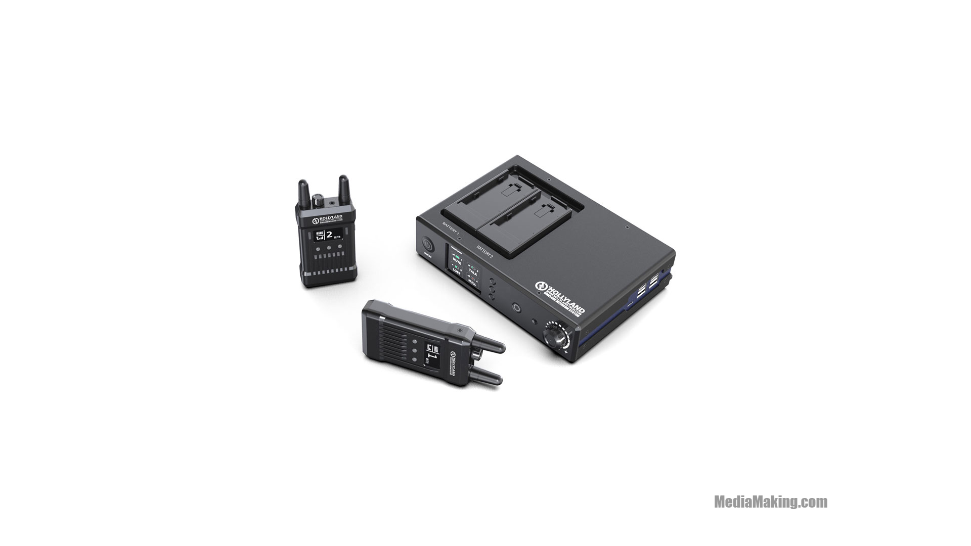 La stazione base supporta il tally wireless ed è dotata di schermo OLED incorporato che visualizza lo stato di ogni ricetrasmettitore. È inoltre dotata di jack da 3,5 mm per le cuffie incluse e un pulsante che disattiva i microfoni sui ricetrasmettitori. La stazione base ha quattro porte USB per caricare i ricetrasmettitori e per la connessione dati abbinata. I 4 trasmettitori inclusi nel sistema intercom wireless Hollyland MarsT1000 hanno ciascuno una batteria integrata agli ioni di litio che garantiscono 8 ore di funzionamento e supportano la ricarica tramite porta USB. Ogni trasmettitore ha una porta da 3,5 mm per una combinazione cuffia/microfono e un pulsante individuale di mute/call. Un grande schermo OLED visualizza lo stato della batteria e la potenza del segnale wireless, nonché il numero corrispondente e lo stato di silenziamento del microfono.